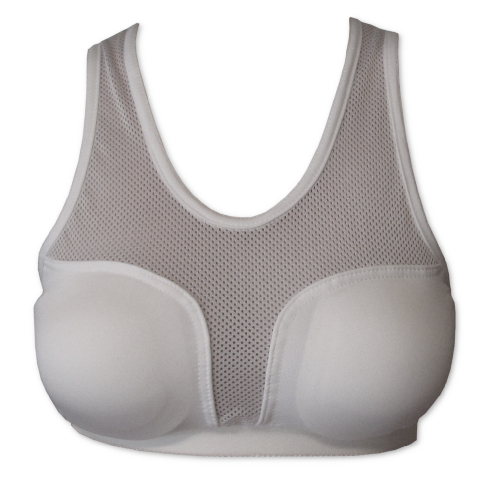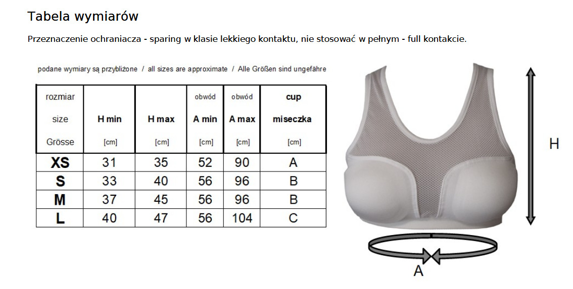 Zakładanie: należy zakładać jak zwykłą koszulkę na ramiączkach następnie dokładnie dopasować położenie miseczek do kształtu ciała, można zakładać na cienkie koszulki bawełniane typu T-shirt. Orientacyjny dobór rozmiaru “XS”-50-65A, “S”-55-70B, ”M”-55-75B, ”L”-60-80C. Zalecamy w miarę możliwości konsultację doboru wielkości ochraniacza z trenerem. Powierzchnia skutecznej ochrony to 100% powierzchni wypełnionej pianką.